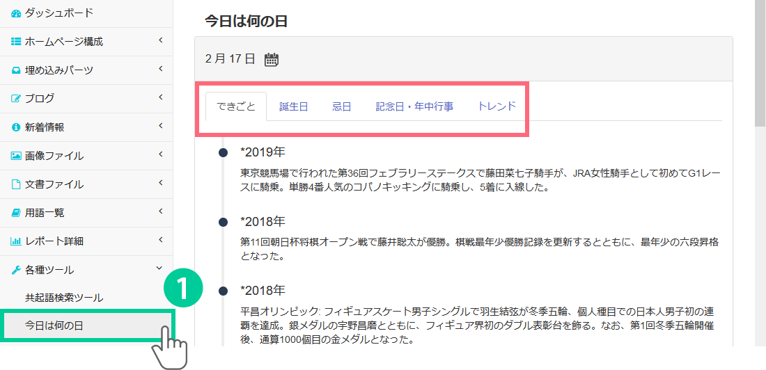 1.管理画面の左側にあるメニューから「各種ツール>共起語検索ツール」をクリックします。