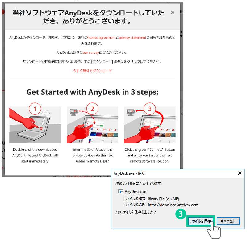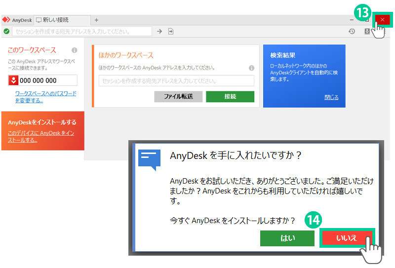 保存されたAnyDeskのアプリケーションファイルは、リモート操作終了後、ファイルの削除をお願いします。
