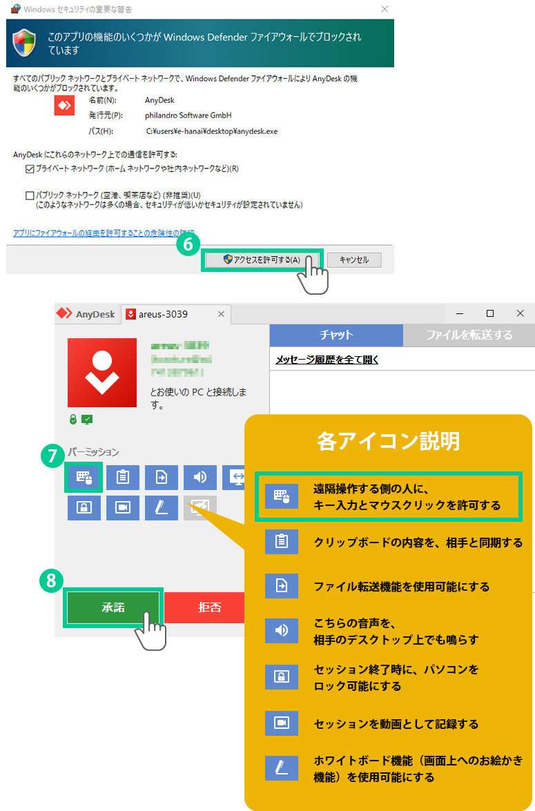 また、AnyDeskが起動している場合でも、「承諾」を押さない限り第三者が勝手にリモート接続することはできませんのでご安心ください。