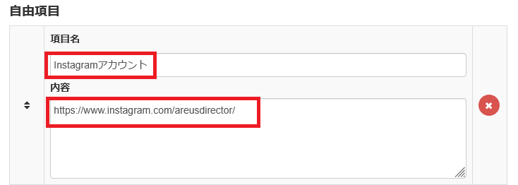 - スタッフパーツの「自由項目」に、『Instagramアカウント』『アカウント対象URL』を入力する。