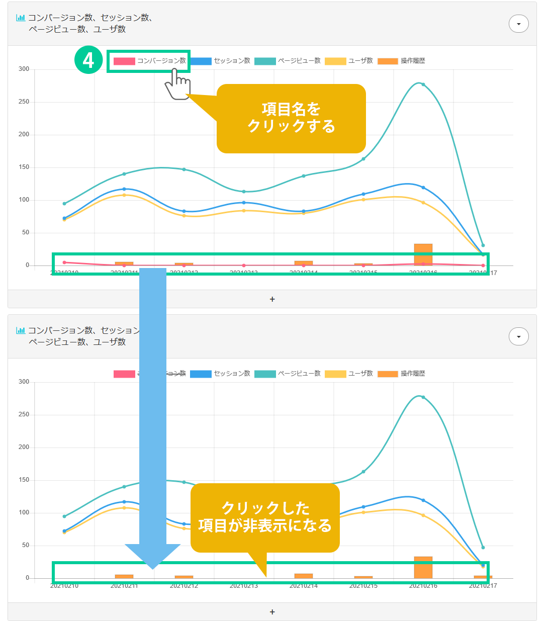 4.項目名をクリニックすると、対象のグラフが非表示になります。再度クリックすると表示されます。