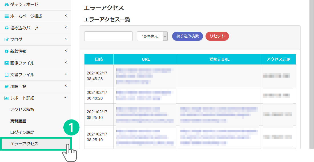 1.管理画面の左側にあるメニューから「レポート詳細>エラーアクセス」をクリックします。 エラーアクセス一覧が表示されます。