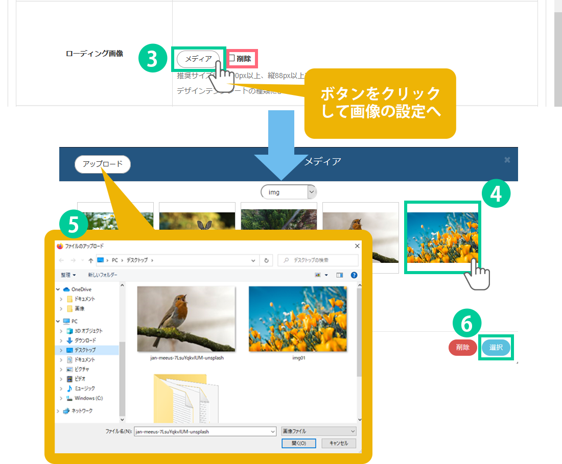 「アップロード」をクリック、画像を選択して「開く」ボタンを押すと、既に登録している画像の一覧に表示されます。後は④番と同様、表示させたいローディン画像を選択します。