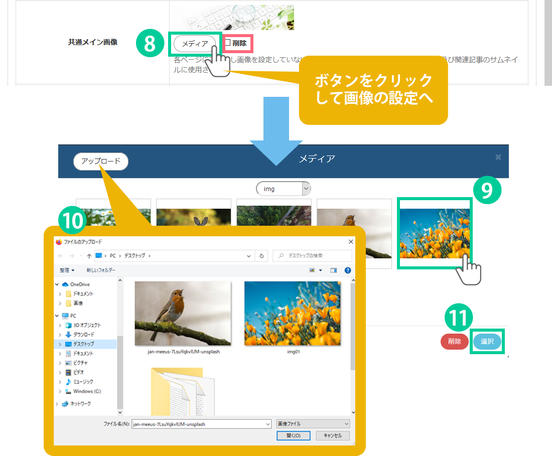 「アップロード」をクリック、画像を選択して「開く」ボタンを押すと、既に登録している画像の一覧に表示されます。後は⑨番と同様、表示させたいローディン画像を選択します。