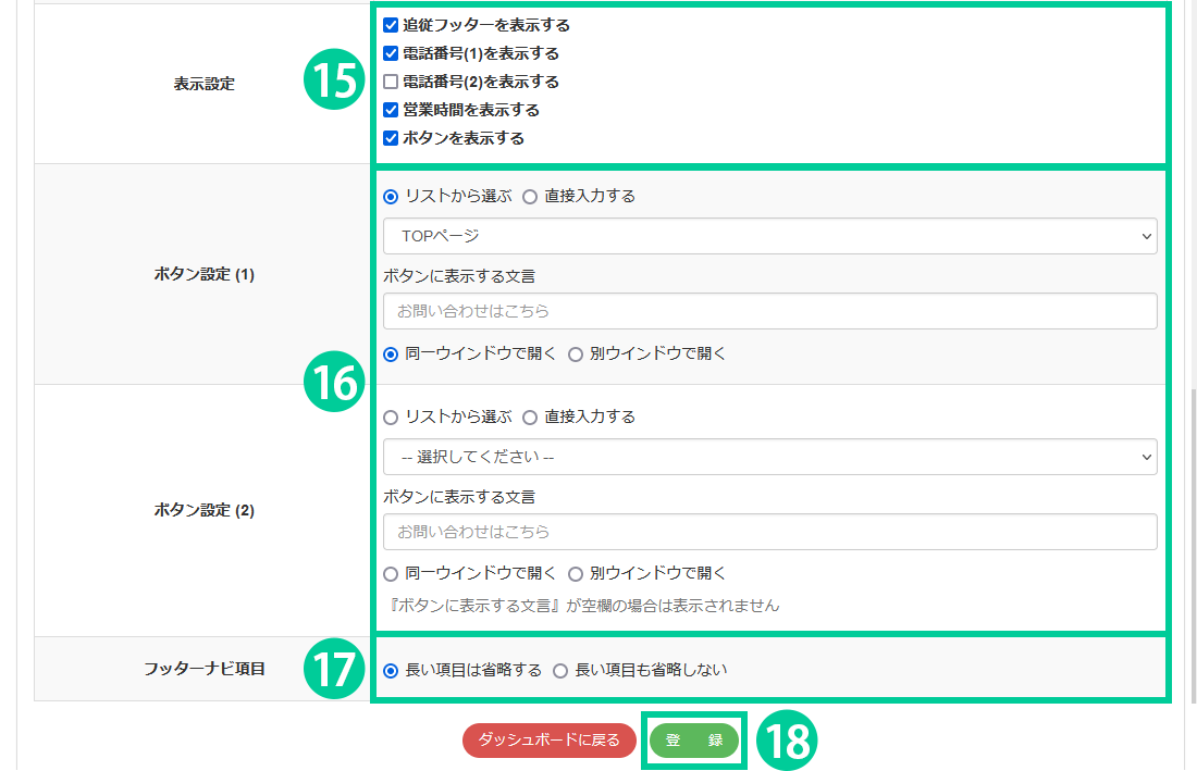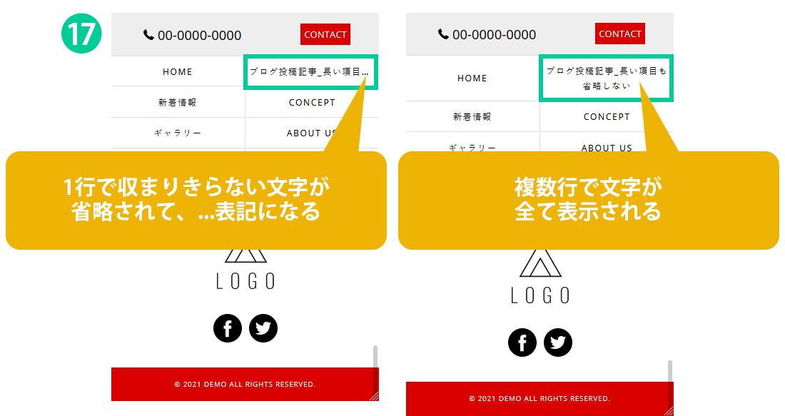 下記画像は、上記の17番で説明したフッターナビの反映イメージです。(番号は説明とリンクしています。)