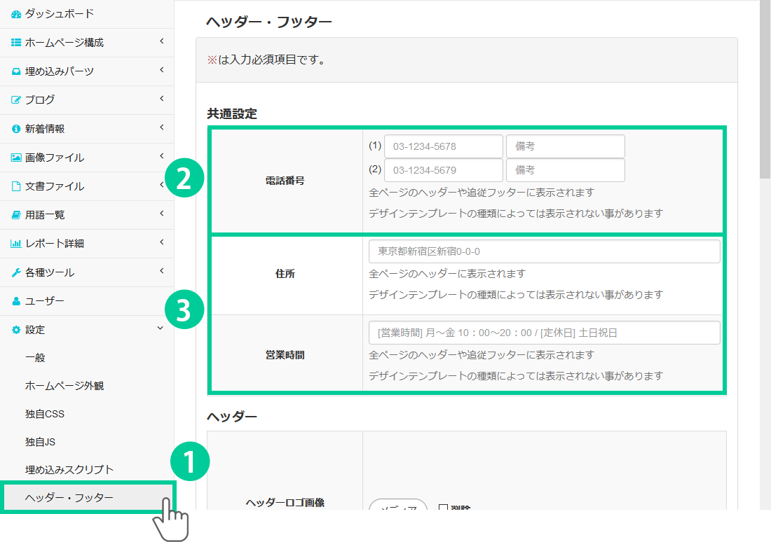 このページでは、ヘッダー・フッターの設定ついてご説明します。