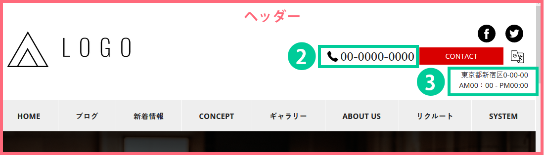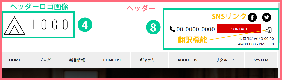 下記画像は、上記で説明したヘッダーの反映イメージです。(番号は説明とリンクしています。)