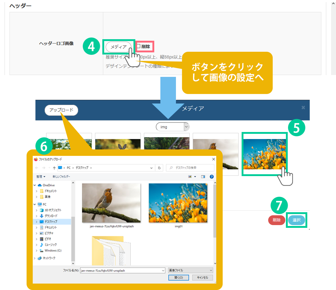 「アップロード」をクリック、画像を選択して「開く」ボタンを押すと、既に登録している画像の一覧に表示されます。後は⑤番と同様、表示させたい画像を選択します。