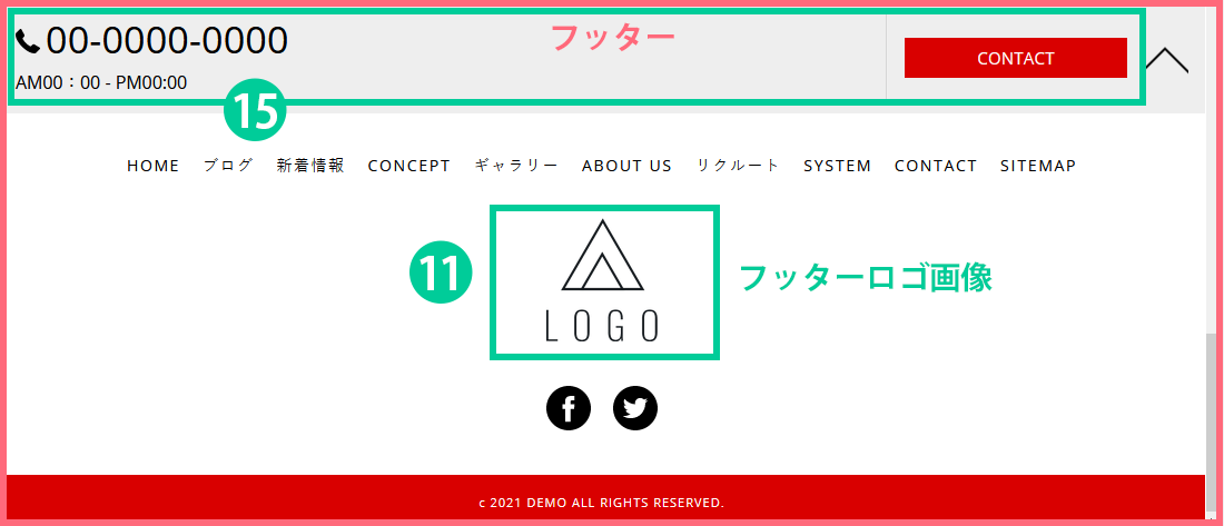 下記画像は、上記で説明したフッターの反映イメージです。(番号は説明とリンクしています。)