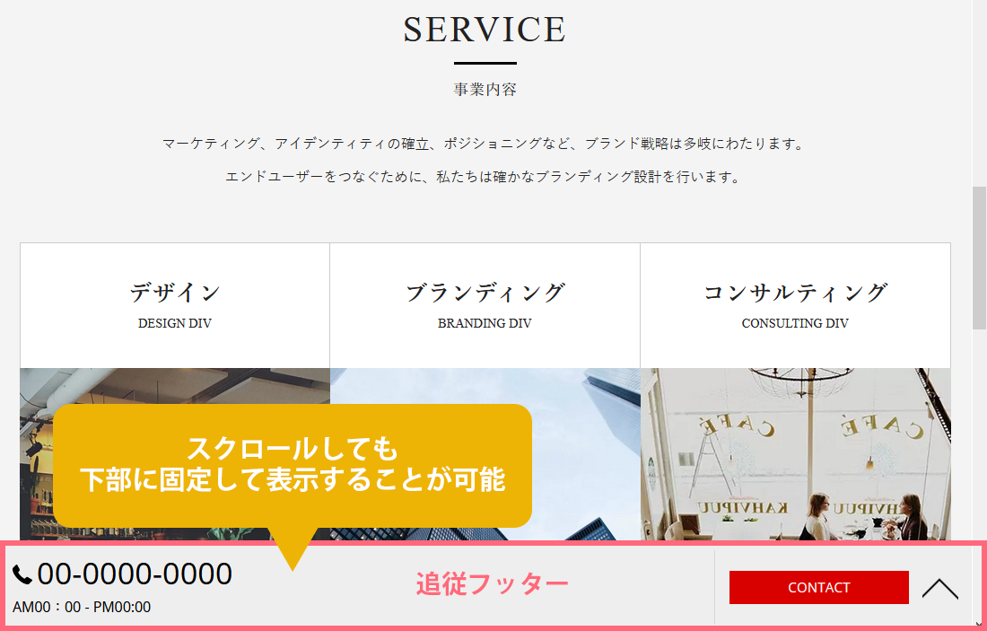 追従フッターとは、ウィンドウ下部に固定することでスクロールした場合も表示されるようになります。