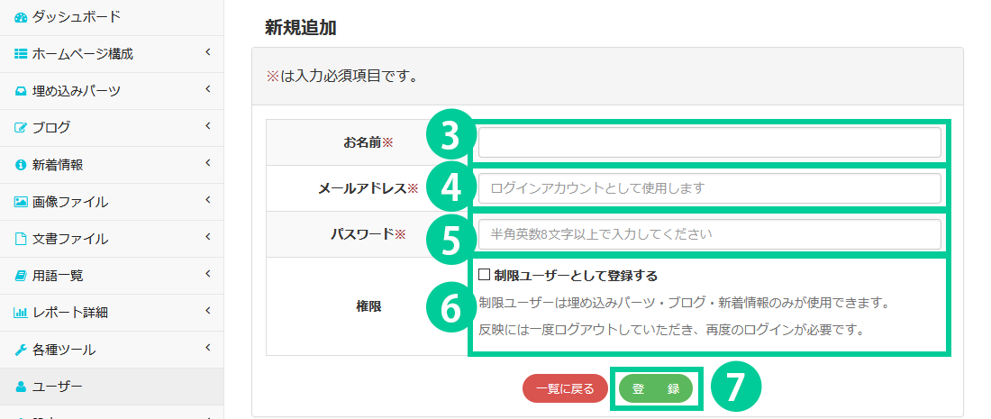「制限ユーザーとして登録する」にチェックを入れると、このユーザーで管理画面にログインした場合、埋め込みパーツ・ブログ・新着情報のみが使用可能となります。他の機能は管理画面上では閲覧することが出来ません。