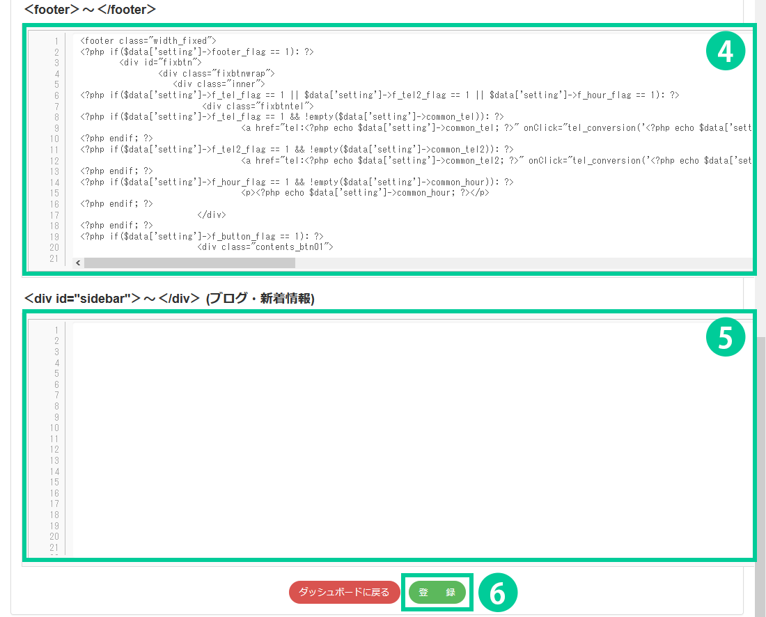 5.sideber(ブログ・新着情報)の記述内で、設定を変えたい部分がある場合はタグを編集します。